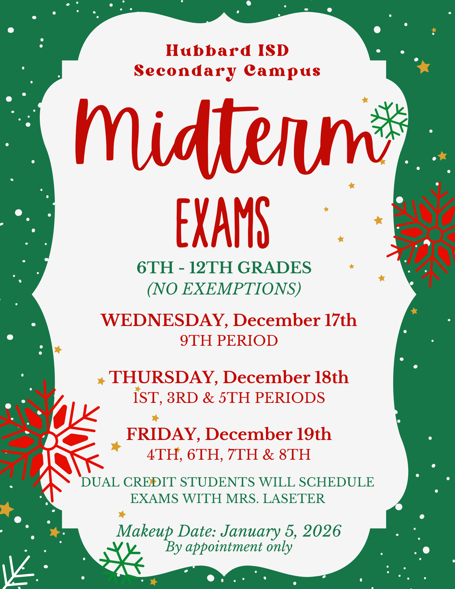 Hubbard ISD Secondary Midterm Exam Schedule