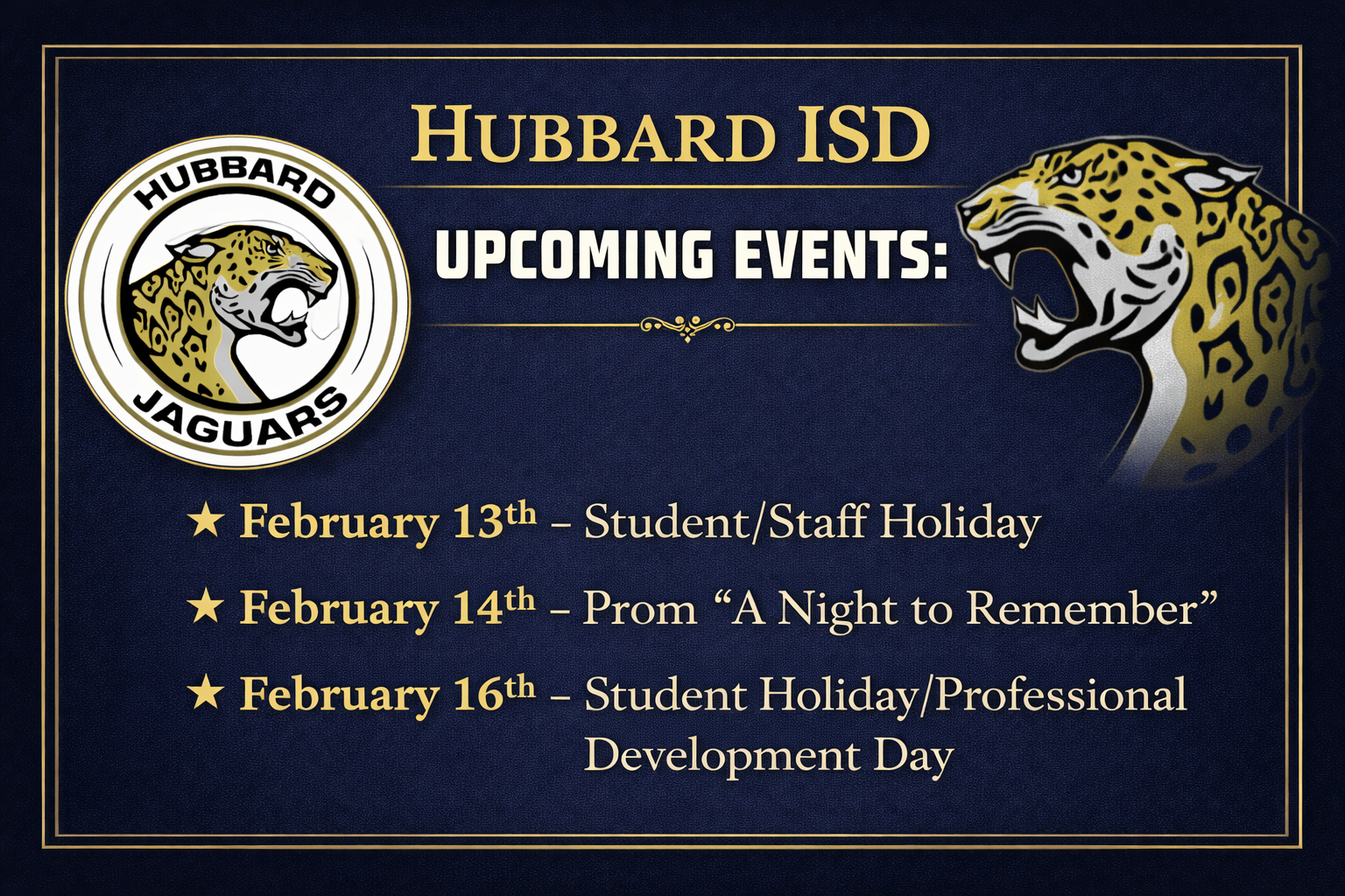 Hubbard ISD will be closed on Friday, February 13th for a Student/Staff Holiday. Prom will be at Parsons Castle in Whitney on Saturday, February 14th. Monday, February 16th is a Staff Professional Development Day/Student Holiday. Classes will resume at 7:50 AM on Tuesday, February 17th.